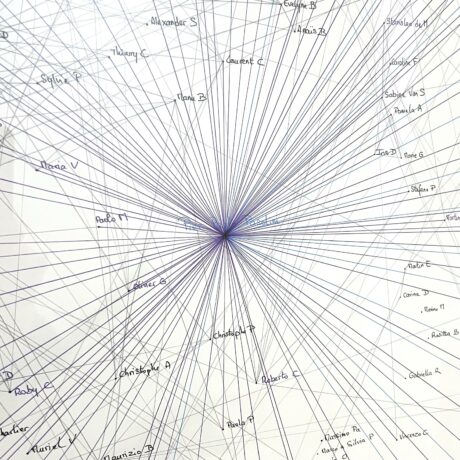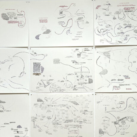 “Deliberately focused on the experimental since its opening, the Kamer 9 gallery, owned by artist-collector Baudouin Oosterlynck, presents the work of Chantal Vey, who here concentrates on mapped territory. The seismograph of her cartography weaves its web around a figure who has haunted her personal journey for years : Pier Paolo Pasolini. The work and life of the Italian filmmaker obsess her deeply. One of her latest cartographies concerns the novel Petrolio, which she revisits for the 50th anniversary of Pasolini’s death, like an investigator searching for connections in a constant effort to unravel a mystery.”