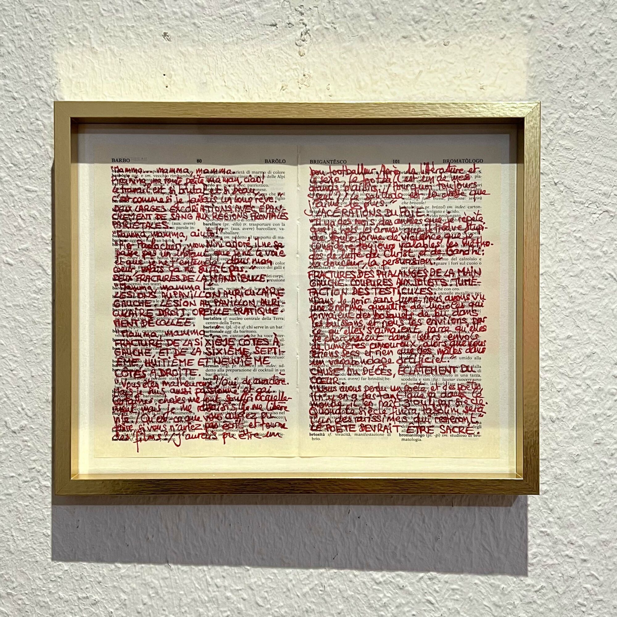 <i>Mamma...Mamma</i>, 2025, Red ink on the dictionary "Il Piccolo Palazzi" published in 1992, gold-painted wooden frame, glass, 20 x 25 cm, unique piece