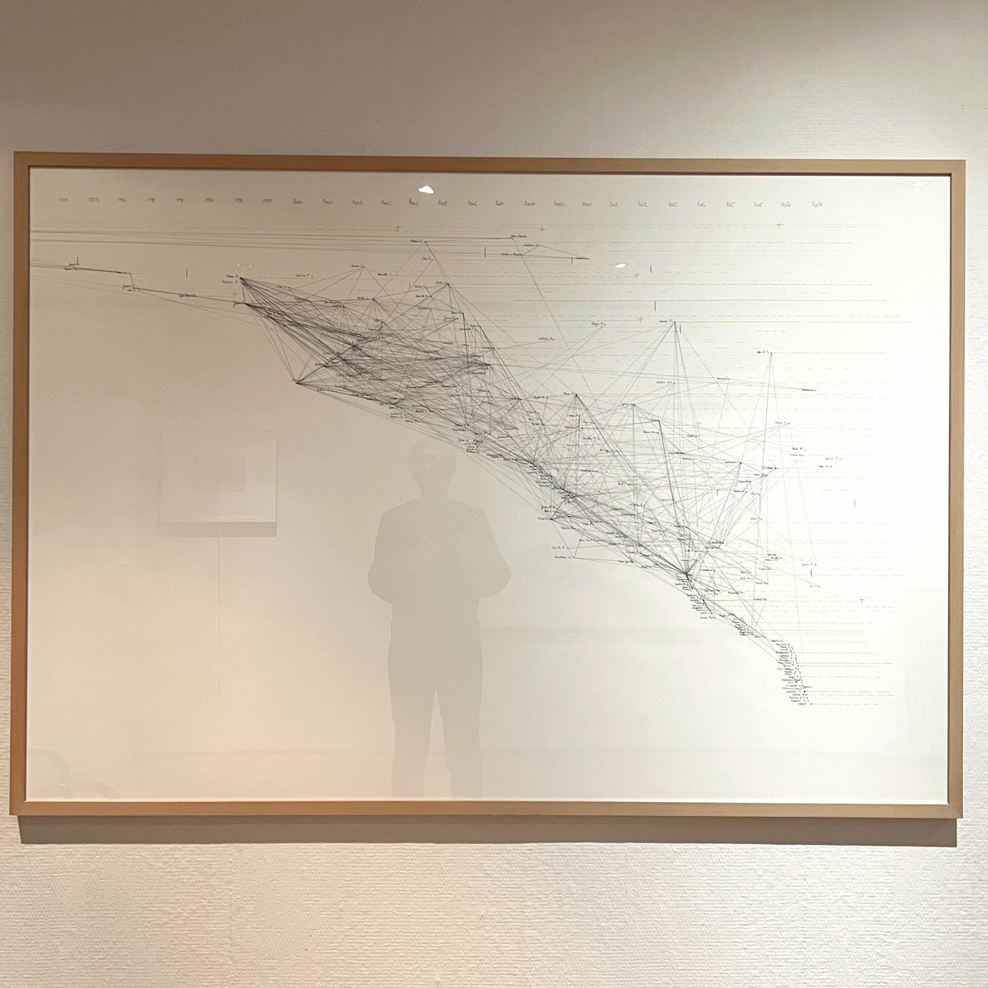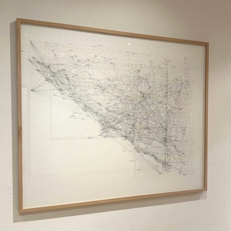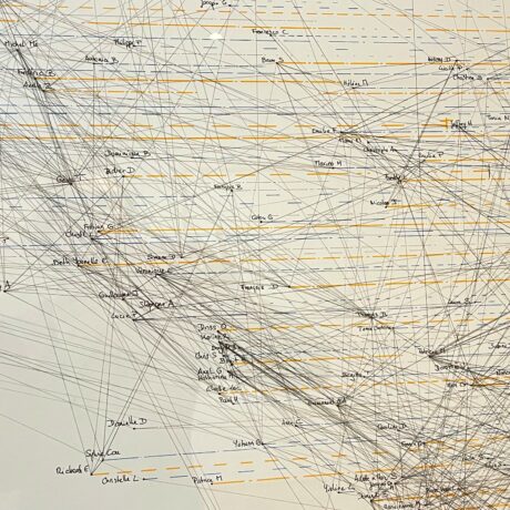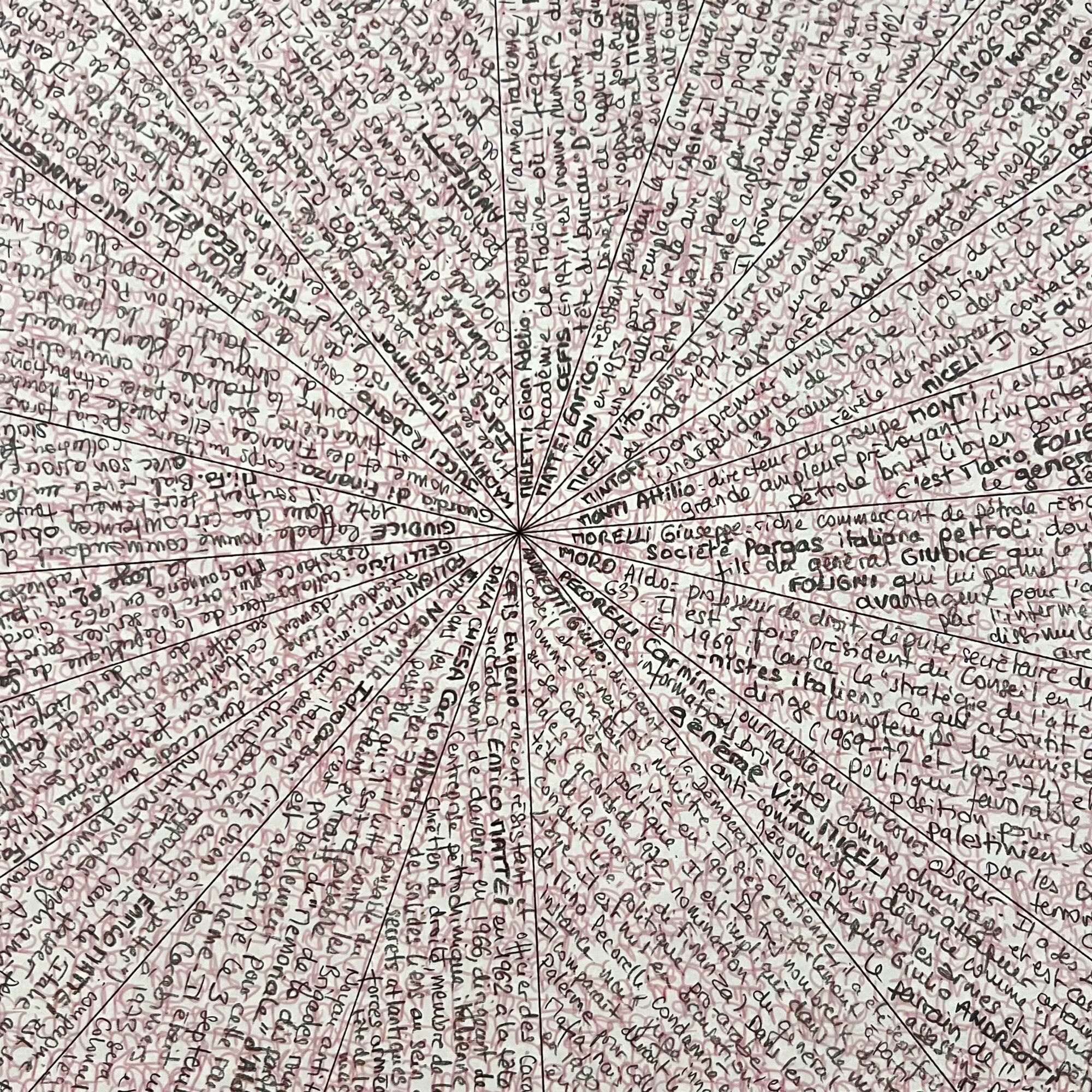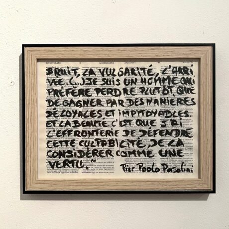 “Deliberately focused on the experimental since its opening, the Kamer 9 gallery, owned by artist-collector Baudouin Oosterlynck, presents the work of Chantal Vey, who here concentrates on mapped territory. The seismograph of her cartography weaves its web around a figure who has haunted her personal journey for years : Pier Paolo Pasolini. The work and life of the Italian filmmaker obsess her deeply. One of her latest cartographies concerns the novel Petrolio, which she revisits for the 50th anniversary of Pasolini’s death, like an investigator searching for connections in a constant effort to unravel a mystery.”