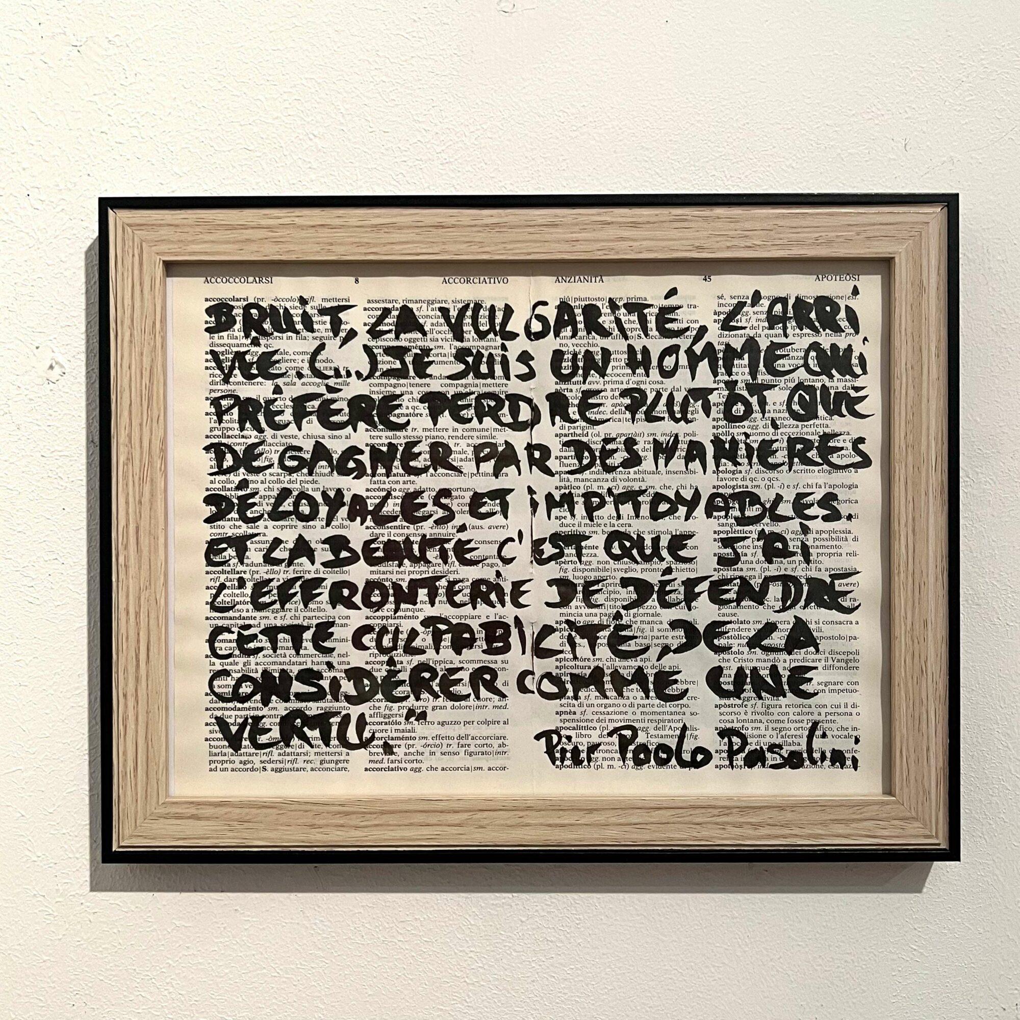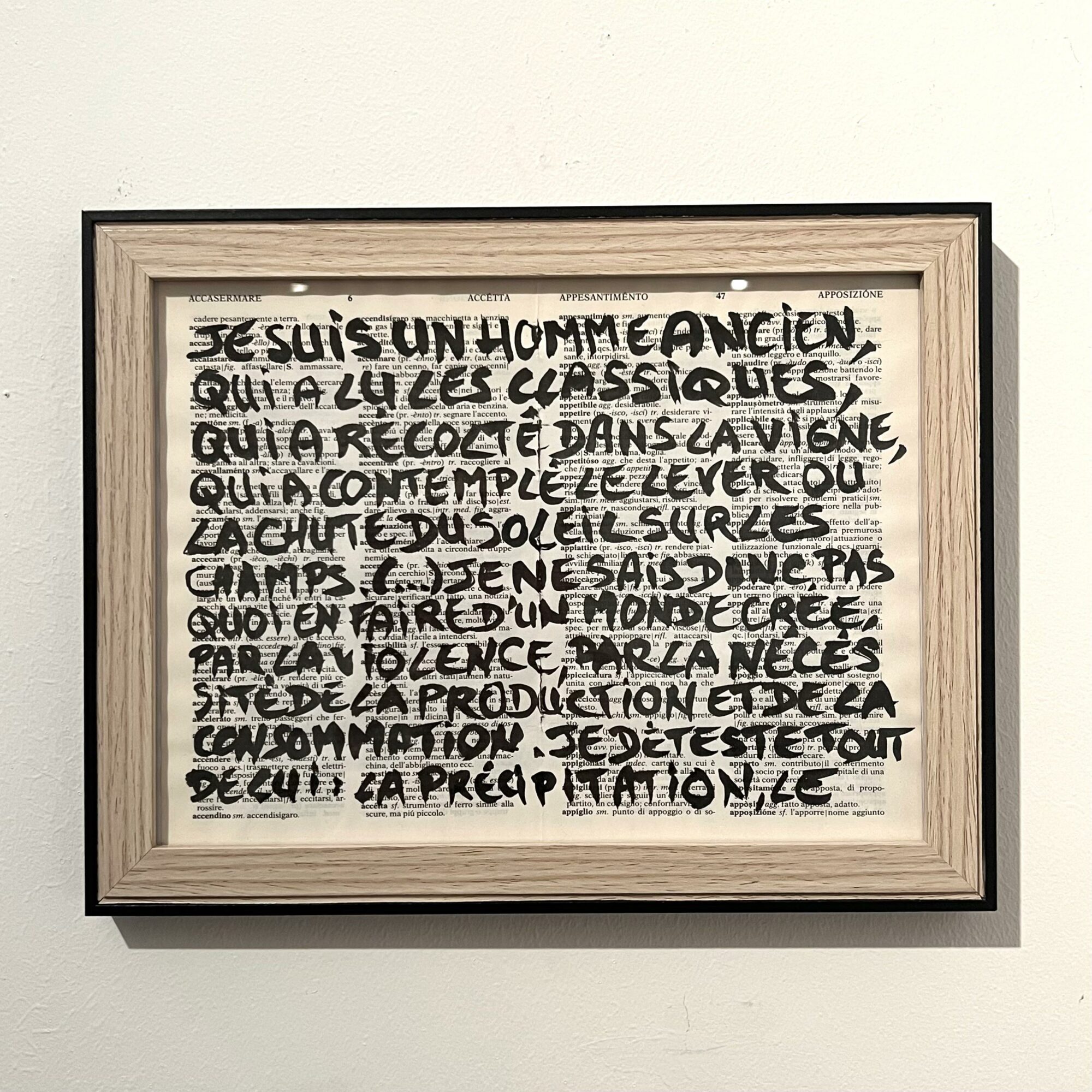 <i>Un homme ancien</i>, 2025, india ink on the dictionary "Il Piccolo Palazzi" published in 1992, diptych composed of two wooden frames in a black American-style box, glass, 18 x 24 cm each, unique piece